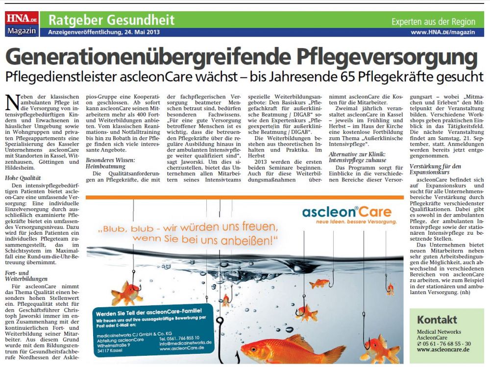 Neben der klassischen ambulanten Pflege ist die Versorgung von intensivpflegebedürftigen Kindern und Erwachsenen in häuslicher Umgebung sowie in Wohngruppen und privaten Pflegeappartements eine Spezialisierung des Kasseler Unternehmens ascleonCare.