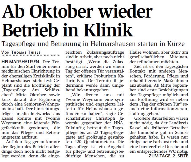 Tagespflege und Betreuung starten in Helmarshausen in Kürze